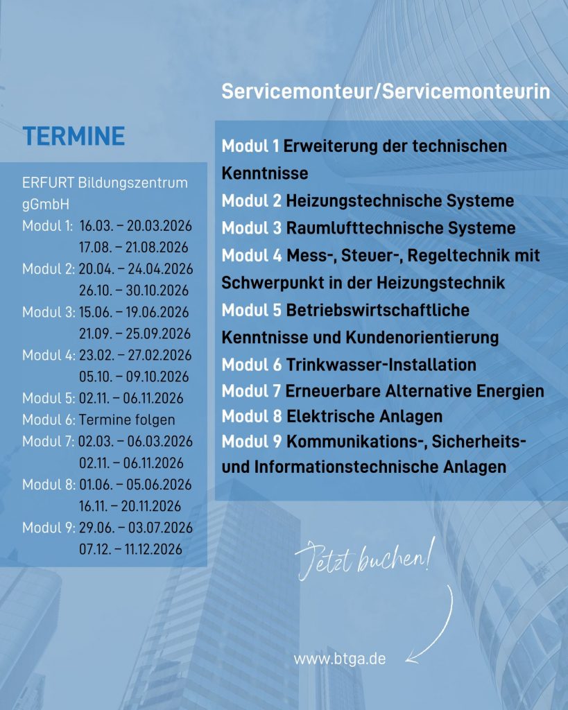 • Modul 2: Fachspezifische Kenntnisse der Heizungstechnik (20.-24.04.2026, 26.-30.10.2026)